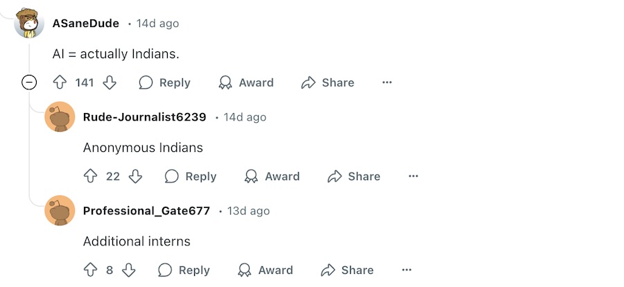 היו כאלה שטענו כי הוא אולי לא יעסיק תכנתים חדשים, אבל יעסיק בהחלט רבים במיקור חוץ. התחיל שרשור הומוריסטי על ראשי התיבות AI, כאשר היו הצעות ל״בעצם הודים״, ״הודים אנונימיים״ או ״עוד מתמחים״. מזכיר לי שפעם אגרונום אמר לי שהשם הנוסף של חקלאות אורגנית הוא ״מדבירים בלילה״.המממ.